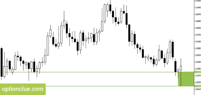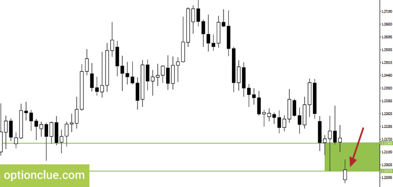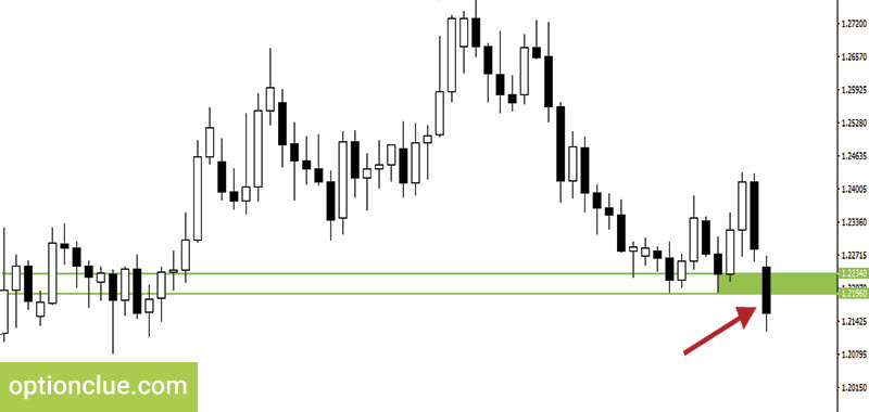 Далее закрылась бычья свеча, которая обновила уровень сопротивления. Был сформирован новый уровень поддержки, ценовой диапазон 1.2196 – 1.2234. Это классический уровень первого типа, он сформировался на основании двух медвежьих и двух бычьих свечей. После закрытия медвежьей свечи следующая открылась с небольшим гэпом и закрылась ниже уровня поддержки (Рисунок 3).
