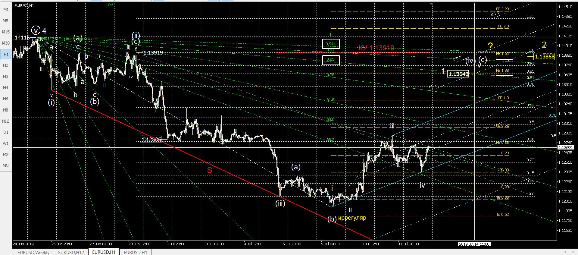 Волновой анализ eurusdИтак, в пятницу цели обозначились. Предлагаю Вам посмотреть мой рабочий часовой графмк. Из двух целей я отдаю предрочтение первой 1.13646. А там как уж получится... Посмотрим...