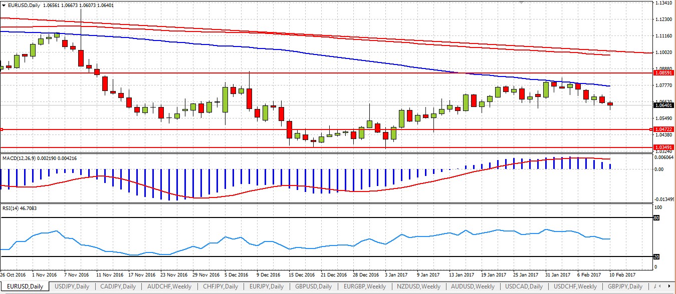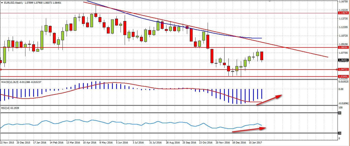 EUR/USD: ждем! Пара EUR/USD на прошедшей недели оказалась под давлением заявлений политиков и чиновников ЦБ. Заявления Трампа по поводу дерегуляции дали молоток в руки долларовым быкам, опустив ее ниже 1.0650. Мы по-прежнему склоняемся к продаже пары, но на текущих уровнях лучше где-то отсидеться с удочкой. Недельная картина показывает коррекцию, индикаторы RSI и MACD медленно растут и наш ключевой уровень 1,0860 пока не достигнут. Думаем, что коррекция еще не закончена и пара все же поднимется до этого уровня.