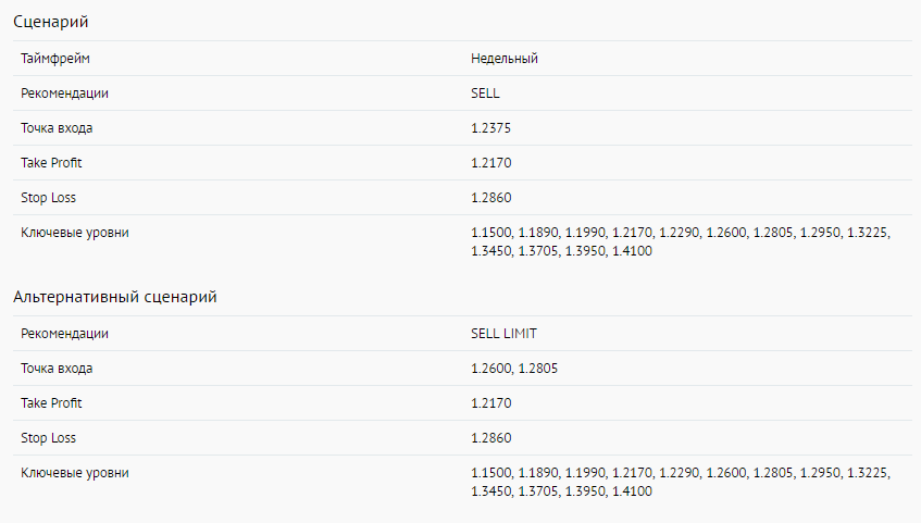 В данной ситуации можно открывать короткие позиции от текущего уровня, а также выставить отложенные ордера от уровней 1.2600, 1.2805 с целью 1.2170 и стоп-лоссом на отметке 1.2860.