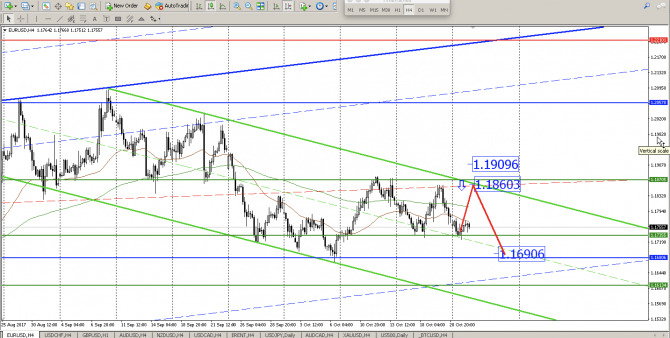 От уровня сопротивления нисходящего канала Н4 считаю целесообразным продавать пару. Можно установить Sell Limit 1,1860 SL 1,1910 TP 1,1690. (см. скрин)