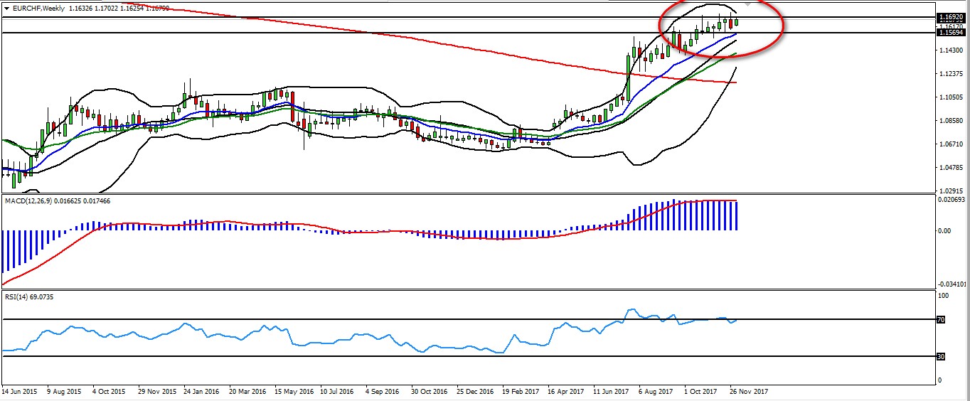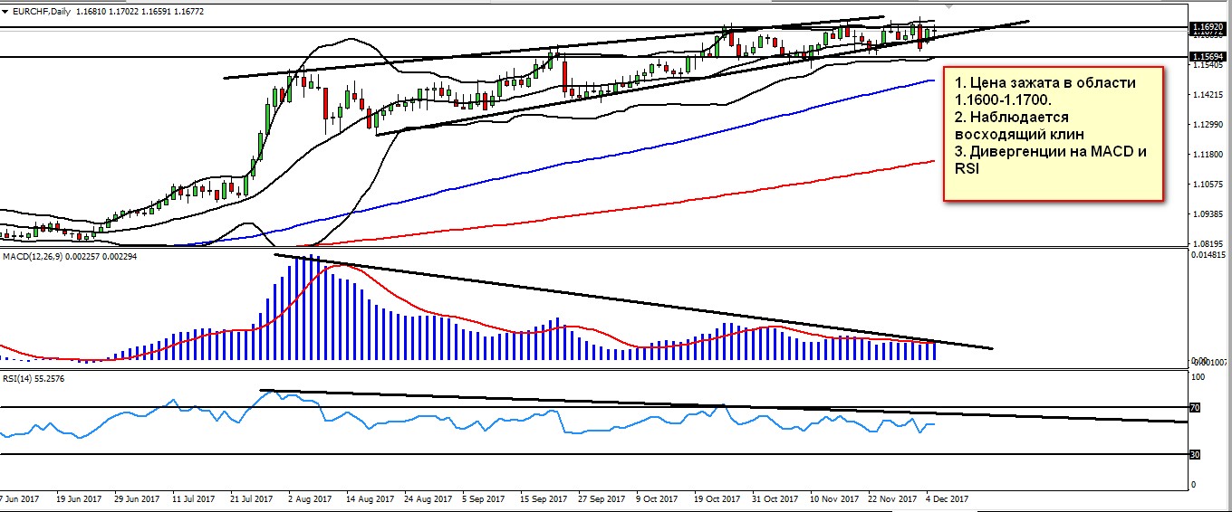 Перспективы EUR/CHF Взглянув на недельный график валютной пары EUR/CHF мы заметили несколько особенностей. Несмотря на очень резкий рост пары еще летом, чувствуется ослабление растущего импульса. Недельный график показывает плоскую картину на MACD и падающую на RSI. Более того, ленты Боллинджера начинают очень сужаться, показывая предел роста пары.