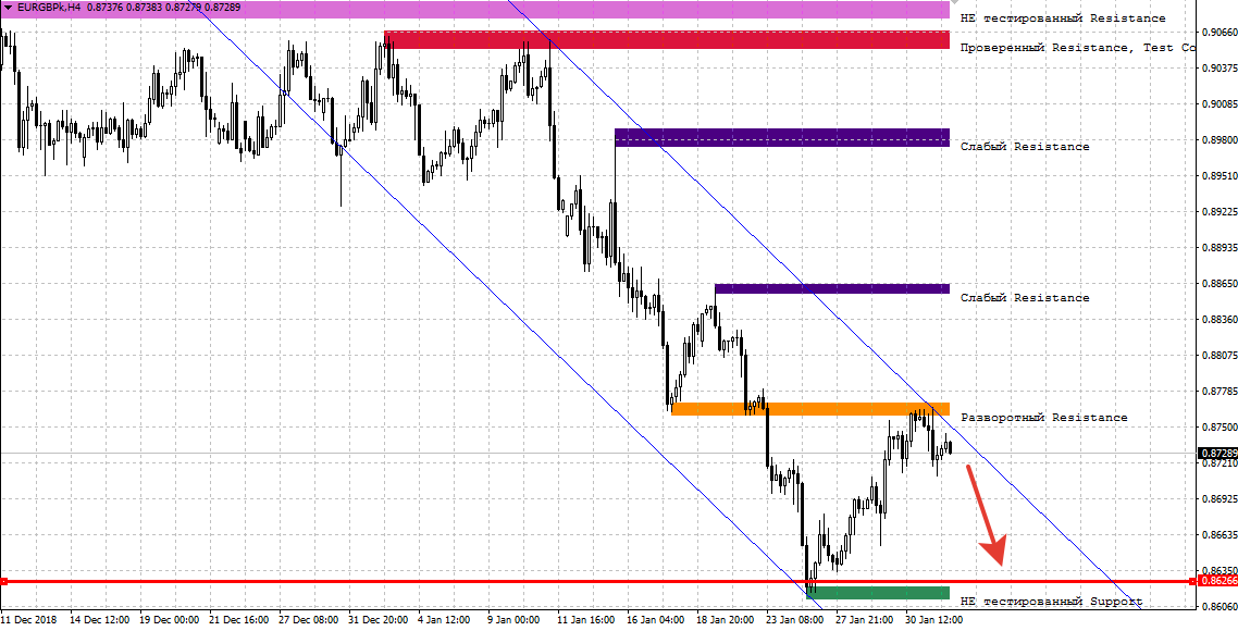 После разворотного уровня, цена пошла вниз. Мы получили хороший профит на этом движении. В данный момент наблюдается отбой от границ канала вниз. Ближайшая цель 0.8626
