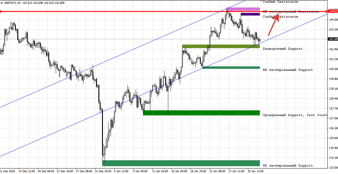 Что мы видим? Восходящий канал вверх, цена подошла к границе канала, к сожалению нет 100 % отбоя от канала вверх. Но с большой долей вероятности, цена сделает отбой вверх к уровню 144.62.