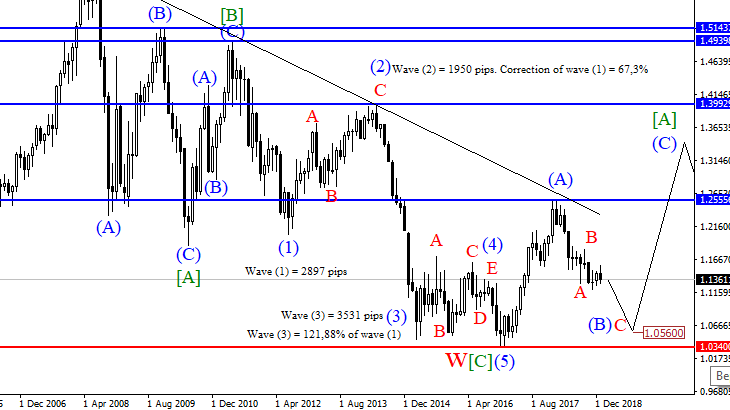 На месячном графике пары EURUSD развивается корректирующая волна (B). Скорее всего данная волна примет вид зигзага.