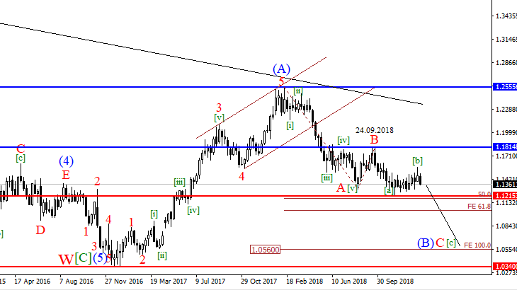 На недельном графике волна B завершилась 24.09.2018 на отметке 1.1814. Она скорректировала волну A на 40,95%. Вполне достаточная глубина коррекции, особенно учитывая, что волна A сформированна в виде импульса, и вся волна (B) на месячном графике формируется в виде зигзага. В данном варианте волновой разметки настораживает только тот факт, что формирование волны B произошло достаточно быстро, по сравнению с формированием волны A.