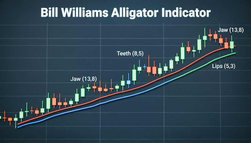 Что такое «Аллигатор» Билла Вильямса?«Аллигатор» Билла Вильямса — это технический индикатор, разработанный для выявления наличия или отсутствия тренда на рынке. Он состоит из трёх сглаженных скользящих средних линий, каждая из которых имеет своё метафорическое название и параметры: «Челюсть» (синяя линия) — 13-периодная SMA, смещённая на 8 баров вперёд; «Зубы» (красная линия) — 8-периодная SMA со смещением на 5 баров; «Губы» (зелёная линия) — 5-периодная SMA со смещением на 3 бара. Смещение линий в будущее позволяет индикатору не просто следовать цене, а как бы «предвосхищать» её движение. Когда все три линии переплетены между собой, это символизирует «спящего аллигатора» — рынок находится во флэте, без чёткого направления, и торговля в такие периоды считается нежелательной.