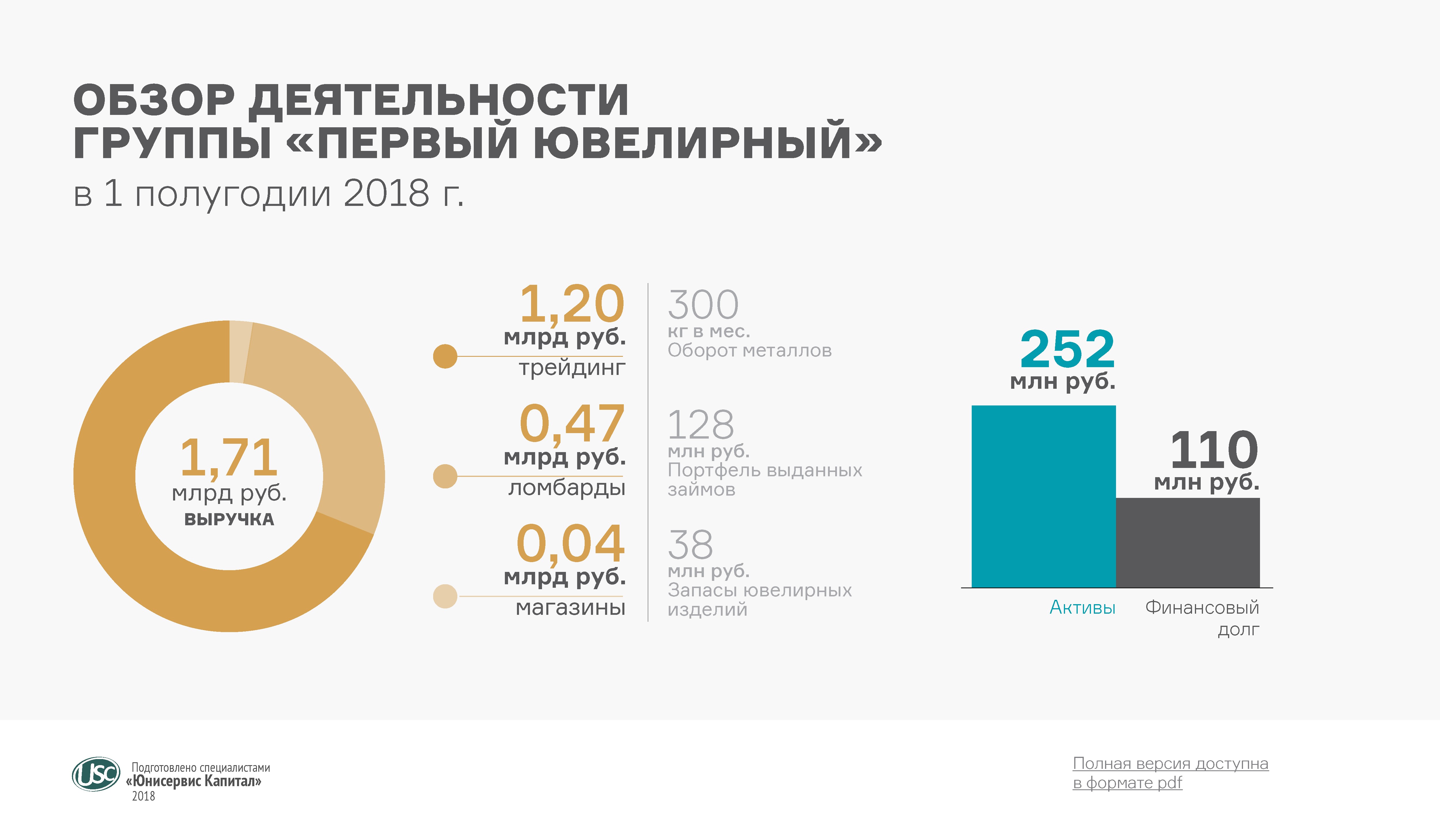«Первый ювелирный» сообщает о результатах работы в первом полугодииАналитики компании «Юнисервис Капитал» продолжают изучать деятельность эмитента ценных бумаг — ООО «ПЮДМ» и всех компаний, относящихся к группе «Первый ювелирный».