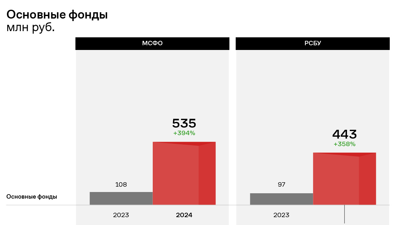 Основные фонды ГК «ХРОМОС» (нематериальные активы и основные средства), согласно МСФО, демонстрируют эквивалентную РСБУ динамику, однако итоговая стоимость отражена более точно и на конец 2024 года составляет 535,2 млн руб. Основную долю в нематериальных активах ГК составляют патенты и капитализированные затраты на разработки, в основных средствах – здания, машины и оборудование, а также незавершенное строительство.