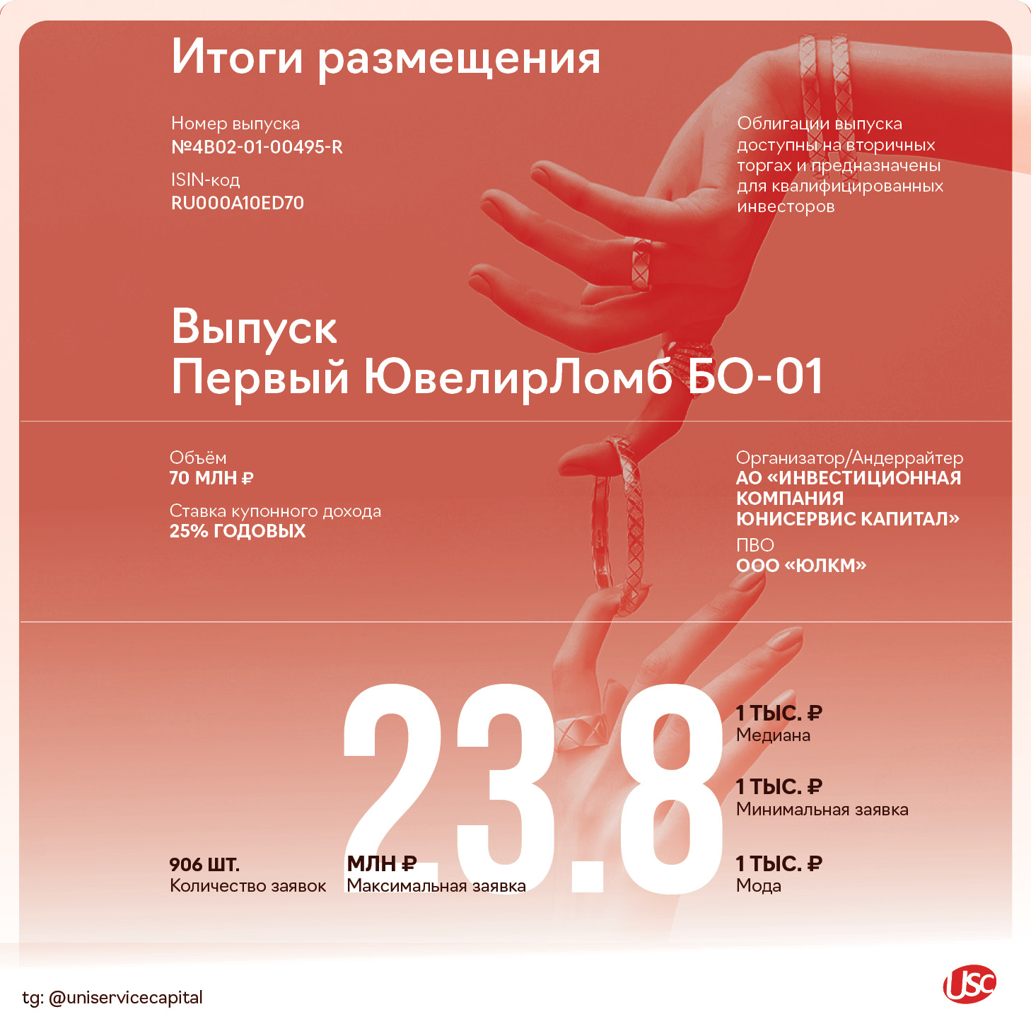 Дебютный облигационный выпуск ООО «Первый ювелирный ломбард» полностью размещёнРазмещение выпуска Первый ЮвелирЛомб БО-01 прошло за один торговый раунд. По выпуску была зафиксирована переподписка и применена аллокация.Инвесторы провели 906 сделок. Сумма максимальной заявки составила 23,75 млн руб., минимальной — 1 тыс. руб., а медианное значение было зафиксировано на уровне 1 тыс. руб.
