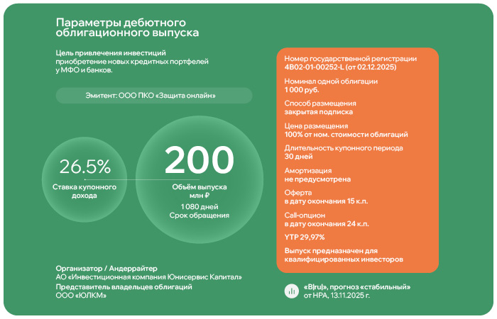 На Московской бирже размещается дебютный выпуск ПКО «Защита онлайн»В 10 утра по московскому времени стартовало первичное размещение выпуска биржевых облигаций Защита онлайн-БО-01 объёмом 200 млн руб. со ставкой купонного дохода на уровне 26,5% годовых, зафиксированной на 15 месяцев.