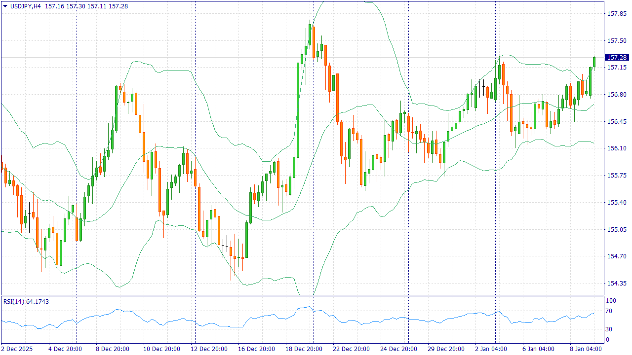 USD/JPY торгуется около 157,20. Спрос на доллар поддерживается ожиданием отчёта США по занятости и динамикой доходностей казначейских облигаций: рынок оценивает, насколько уверенно экономика завершила 2025 год и как это повлияет на решения Федеральной резервной системы по ставке.
