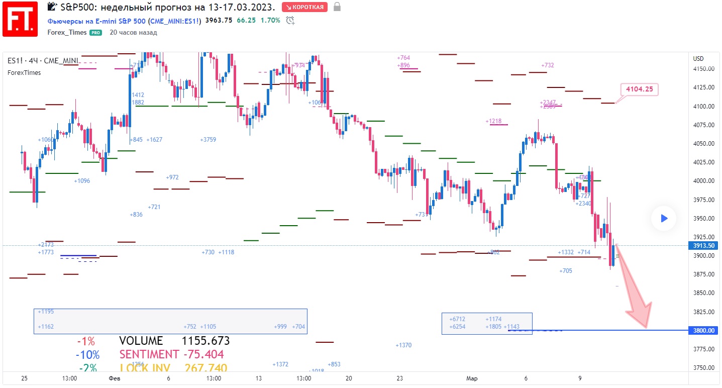 S&P500: недельный прогноз на 13-17.03.2023.Рекомендуется рассматривать продажи по тренду в направлении уровня скопления недельных опционных контрактов PUT на сумму более $20B (3800.00).