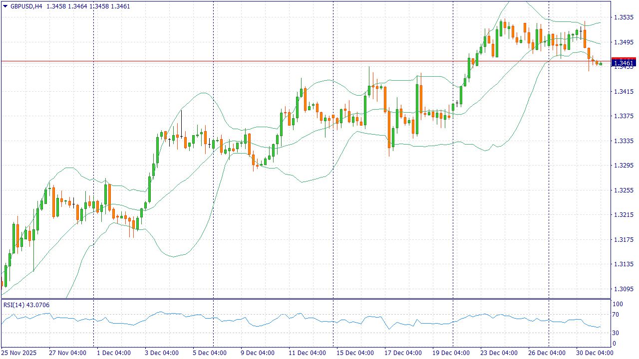 GBP/USD торгуется около 1.3460–1.3470 после спокойной сессии накануне Нового года. Фунт остаётся относительно устойчивым, но рынок входит в январь с повышенной осторожностью: низкая ликвидность усиливает влияние новостных заголовков и приводит к более резким движениям даже без крупных статистических публикаций.