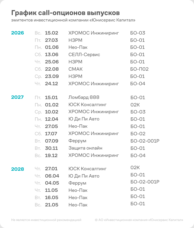 «Сегодня ООО «ХРОМОС Инжиниринг» реализовало call-опцион по выпуску серии БО-03. Это был наш первый опыт использования этого инструмента управления долговой нагрузкой. И я считаю, что опыт удачный. Благодаря совместной работе с организатором — инвестиционной компанией «Юнисервис Капитал» — нам удалось реализовать практически «бесшовное» рефинансирование. 29 декабря 2025 года мы начали размещение выпуска серии БО-04 для погашения бумаг БО-03, а 5 января 2026 года завершили его. И уже 16 февраля 2026 года мы выплатили стопроцентную номинальную стоимость облигаций БО-03 инвесторам. С одной стороны, к дате call-опциона мы подходили с абсолютной уверенностью в том, что на наших счетах есть необходимые 250 млн руб. С другой, период, когда мы обслуживали сразу четыре облигационных выпуска, был непродолжительным.