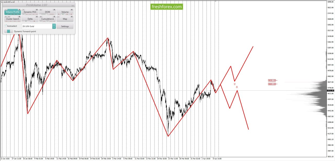 • Долгосрочная тенденция: в шорт. Максимальное скопление объемов текущего контракта расположено в диапазоне, по котировкам 4800.00–4850.00. В настоящий момент по XAUUSD совершаются инвестиционные операции ниже указанного диапазона, что говорит о силе продавцов.