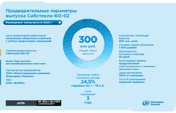 ООО «Сибстекло» планирует разместить новый выпуск облигацийПредварительно на конец августа запланировано размещение выпуска Сибстекло-БО-02 объёмом 300 млн руб., предназначенного для квалифицированных инвесторов.