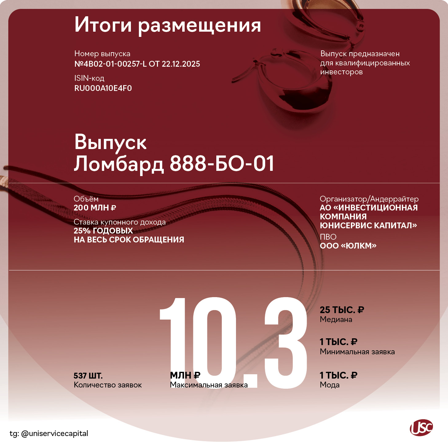 Дебютный выпуск ООО «Ломбард 888» полностью размещёнРазмещение выпуска биржевых облигаций Ломбард 888-БО-01 прошло за 3 дня и завершилось 22 января 2026 года. Весь объём в 200 млн руб. был выкуплен за 537 заявок.