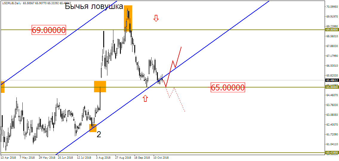 Российская валюта пытается пробить восходящий канал, но при этом на графике есть сильный уровень поддержки – 65.00, который будет трудно пробить, по крайней мере, с первого раза. Пока базовый сценарий такой – отскок от уровня 65.00 с последующим походом вверх (возвращением в восходящий канал). При пробитии уровня 65.00 будем принимать решения по факту: