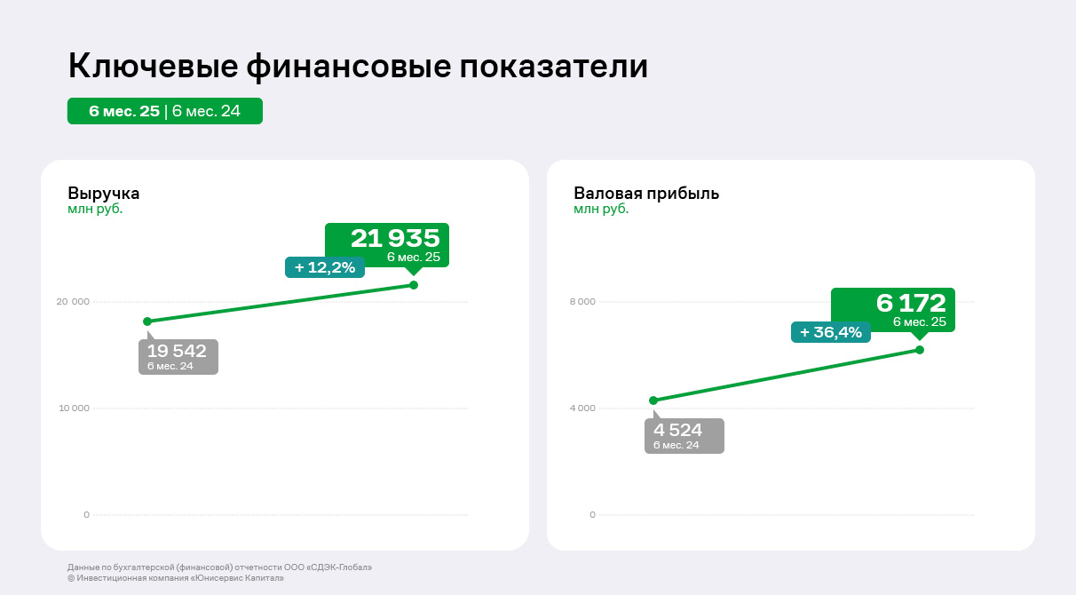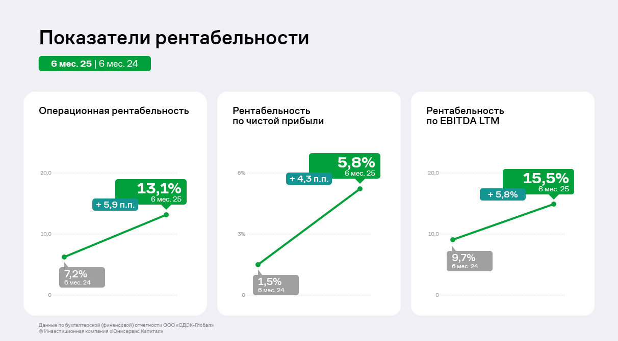 Ключевые финансовые показатели Эмитента на протяжении нескольких лет находятся в восходящем тренде: так, выручка ООО «СДЭК-Глобал» за 6 месяцев этого года выросла на 12,2% относительно АППГ до 21,9 млрд руб. Валовая прибыль аналогично демонстрирует увеличение – рост составил 36,4% к 1 полугодию 2024 года в связи с существенно меньшими темпами роста операционных расходов ООО «СДЭК-Глобал».