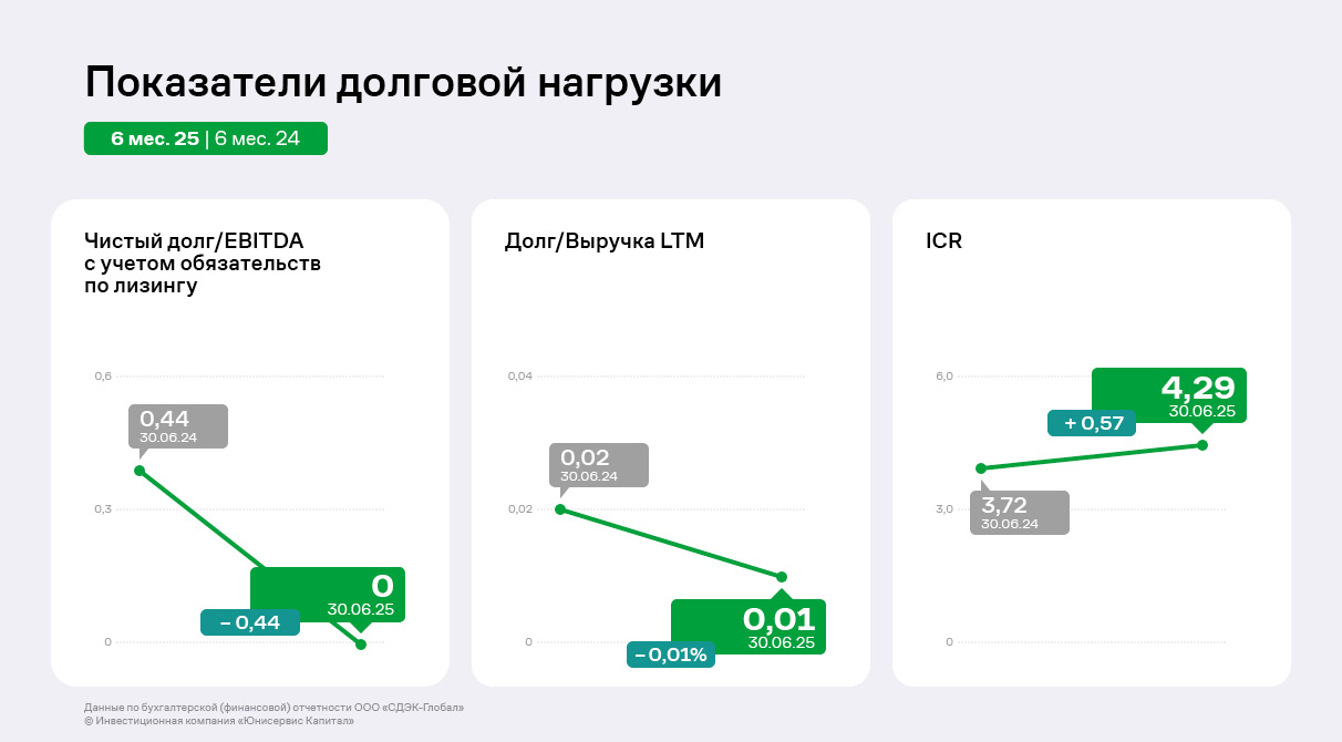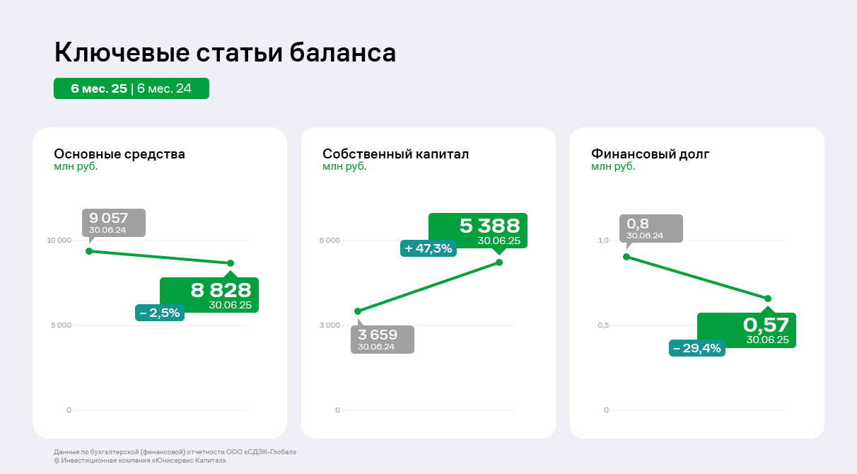 Валюта баланса составила 22,8 млрд руб., что на 15,1% превышает уровень АППГ. Основные средства, которые преимущественно представлены масштабными складскими помещениями, занимают 38,7% в валюте баланса, несмотря на несущественное снижение вследствие начисленной амортизации. Финансовый долг Эмитента продолжает динамично сокращаться в соответствии с графиком гашения. На 30.06.2025 финансовый долг составляет 567,9 млн руб., что на 29,4% ниже уровня 1 полугодия 2024 года. Собственный капитал ООО «СДЭК-Глобал», сформированный почти на 100% нераспределенной прибылью, непрерывно увеличивается и на последнюю отчетную дату достиг 5,4 млрд руб. Данная динамика является прямым следствием существенного роста чистой прибыли: за 6 месяцев текущего года она составила 1,3 млрд руб.