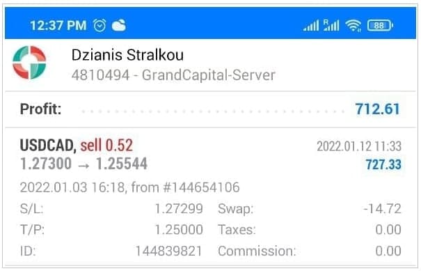 | Ордер по USDCAD, который был открыт 03.01.2022 объемом 1.44 лота и, который был частично закрыт объемом 0.92 лота, был закрыт 12.01.2022 окончательно объемом 0.52 лота, с профитом +0.64% (+712.61$) от депозита (+175 пунктов). |