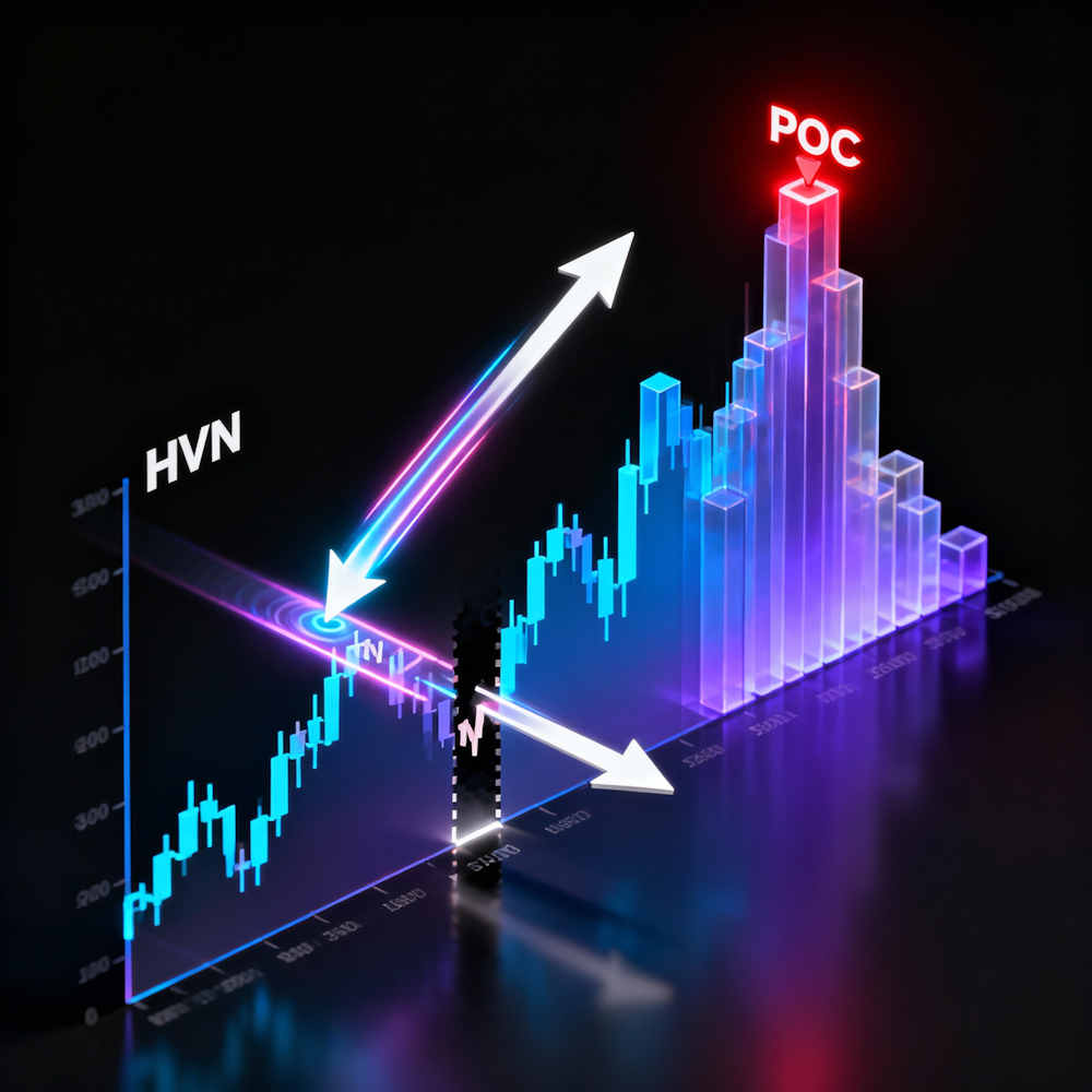 Представьте себе гистограмму, повернутую на 90 градусов и наложенную прямо на ценовой график. Чем выше столбик, тем больше сделок было совершено на этом уровне. Самый высокий столбик называется POC (Point of Control) — точка контроля, цена, на которой было совершено максимальное количество сделок. Зоны с высокими столбиками — это HVN (High Volume Nodes), зоны накопления ликвидности. Зоны с низкими столбиками или их отсутствием — LVN (Low Volume Nodes), «пустоты», где цена прошла быстро, не встретив интереса.