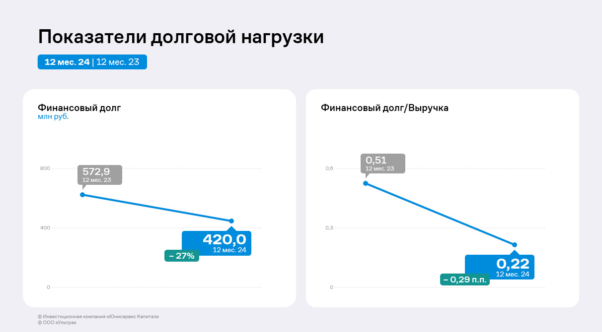 Финансовый долг снизился на 27% по сравнению со значениями прошлого года за счёт существенного сокращения объёма долгосрочных заимствований — эмитент реализовал в 2024 году серию оферт, выкупив 88,8% общей суммы эмиссии по выпуску БО-01 и 60,1% по выпуску БО-02.