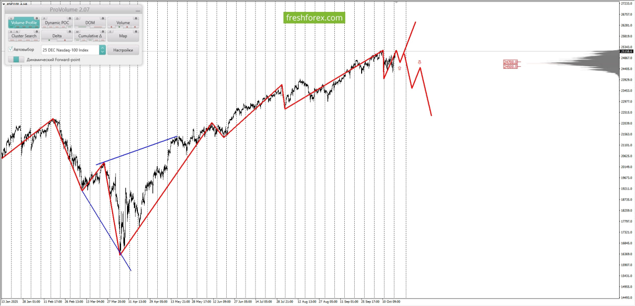 • Среднесрочная тенденция: в лонг. Максимальное скопление объемов среднесрочной тенденции расположено в диапазоне, по котировкам 24700.0–24760.0. В настоящий момент по #NQ100 совершаются инвестиционные операции выше указанного диапазона, что говорит о силе покупателей.