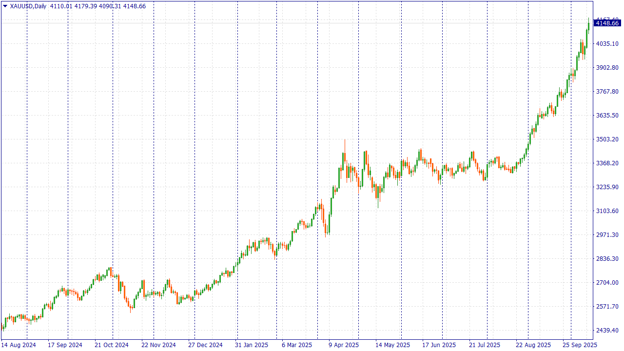 Рынок золота кипит: цель на горизонте — $5 000?Золото взлетело до $4 179 за унцию — новый рекорд. Рынок подогревают ожидания снижения ставок в США, слабый доллар, покупки металла центробанками и притоки в фонды. Геополитические риски добавляют «премию за защиту», подталкивая инвесторов к надёжному активу.