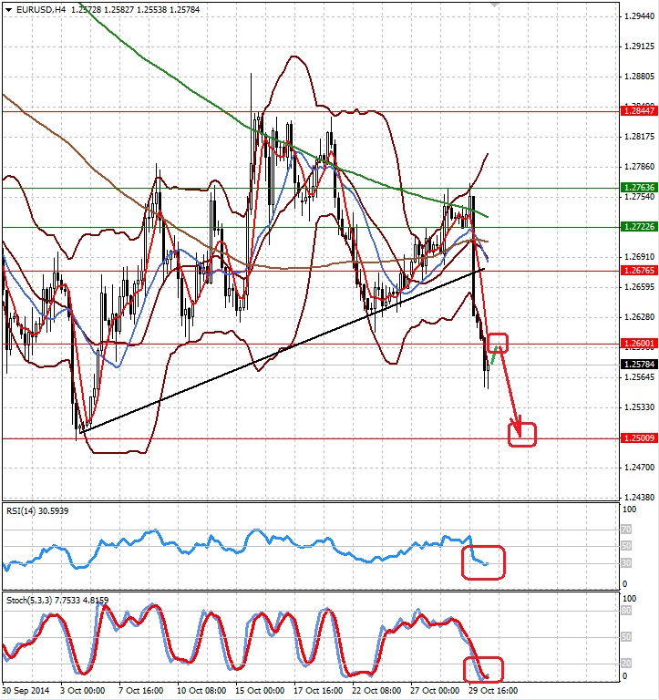 Теханализ для пары EURUSD. 30.10.2014Пара остается под сильным давлением в ожидании дальнейшего расхождения соотношения в процентных ставках в США и еврозоне. Хорошие данные по ВВП США, а также позитивное выступление от Йеллен будут способствовать снижению пары.
