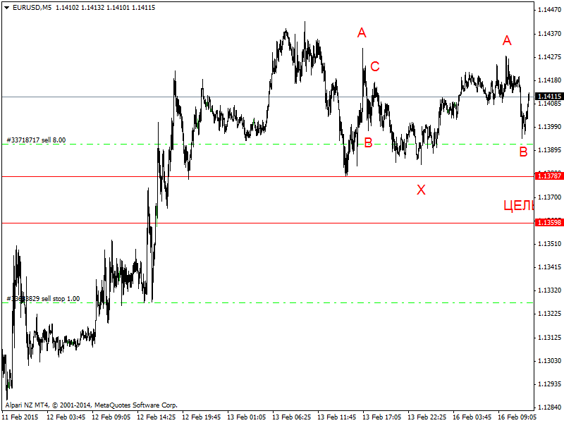 Думаю что рынок сейчас вошел в волну С, поэтому буду продовать пару на пробое волны X (1.1380), и работать в короткой вплоть да достежения отметки 1.1360 - 1.1340, думаю что после достижения вешеуказанной цели последует корекция до 1.1420.