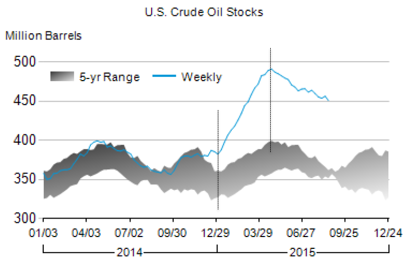 Согласно отчета ENI, за предыдущую неделю коммерческие запасы сырой нефти снизились на 5.5 млн баррелей, что с учетом падения загрузки нефтеперерабатывающих заводов до уровня 94.5% относительно предыдущей недели подтверждает тренд как на замедление объемов добычи нефти, так и на уменьшение объемов переработки, в сумме это — показатель снижения спроса. Быстрый рост запасов с января по апрель происходил на фоне замедления промышленного производства при сохранении высоких темпов добычи, однако в последние месяцы устойчивое снижение запасов с одновременным снижением импорта говорит в первую очередь о том, что темпы добычи нефти снижаются заметно быстрее расчетных.