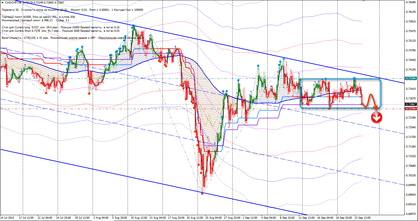 2. CADCHF,H4. Дальнейшее развитие нисходящей тенденции с последующим преодолением графиком цены нижней границы зоны флета, предполагает возможность открытия короткой позиции из области первой трети медвежьего канала.