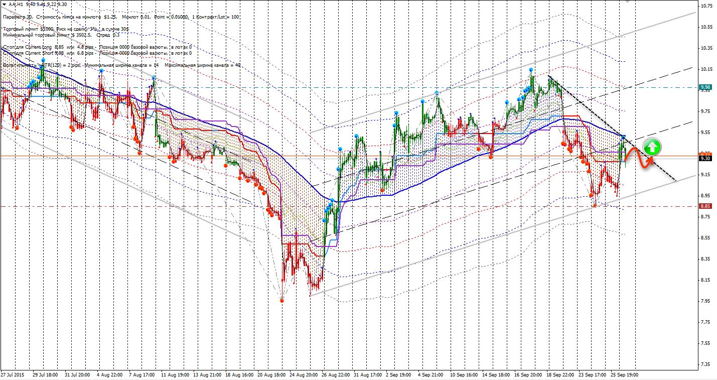 - AA,H1. Развитие восходящей тенденции с последующим пробоем линии сопротивления приведёт к формированию сигнала на вход в дополнительную покупку из зоны первой трети растущего канала.
