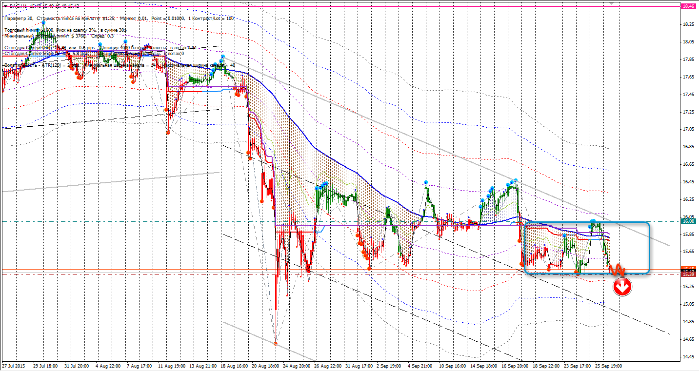 2. BAC,H1. Дальнейшее развитие нисходящей тенденции с последующим преодолением графиком цены нижней границы зоны флета, предполагает возможность открытия короткой позиции из области первой трети медвежьего канала.