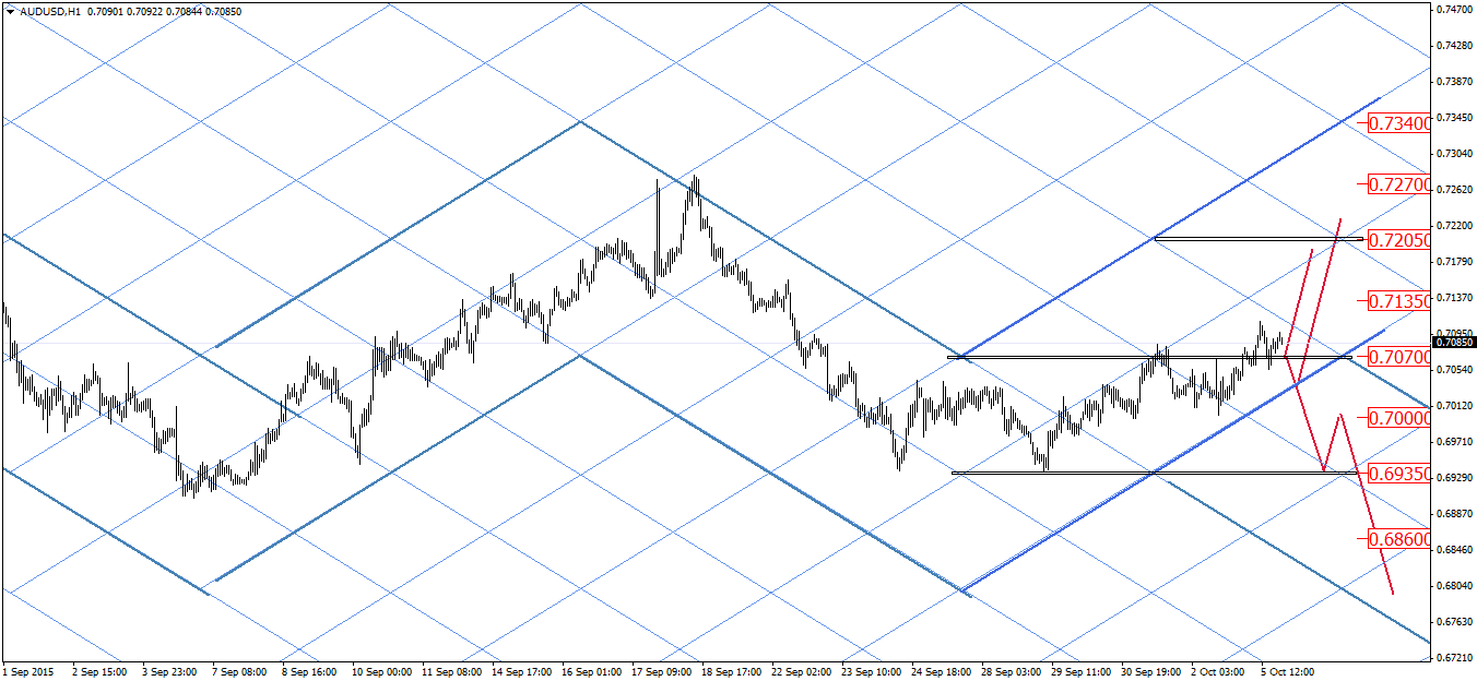 Инструмент в восходящем канале, и пока пара его не сменила на противоположные, покупки имеют больший приоритет. Сегодня пара пробила ближайшее сопротивление(0.7070) и закрепилось за ним. При отбое от этого уровня возможны покупки. Так же, ниже этого уровня находится еще одна поддержка, нижняя граница коридора, при отбое от которой будут благоприятны покупки с коротким стопом и хорошим потенциалом хода. Глобальная цель - верхняя граница канала. Значимые уровни при движении вверх: 0.7135, 0.7205, 0.7270, 0.7340.