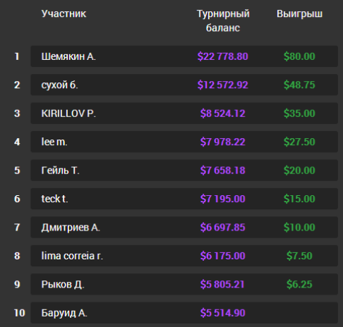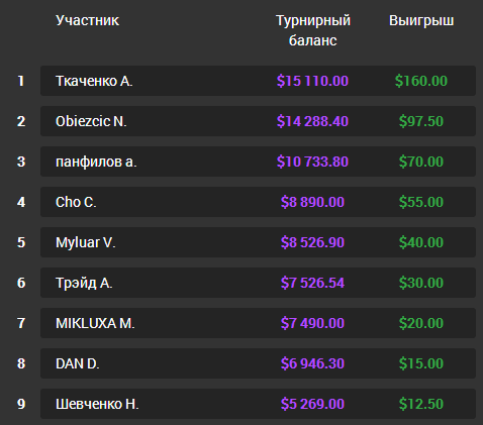 7. По окончании турнира появится итоговая таблица с результатами и распределением призового фонда между участниками, занявшими первые 9 мест.