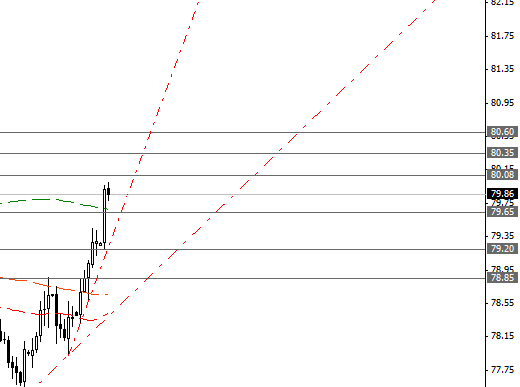 Пара USD/JPY ограничена сопротивлениями вблизи 80.08, 80.35 и 80.60, а также поддержками 79.65, 79.20 и 78.85.