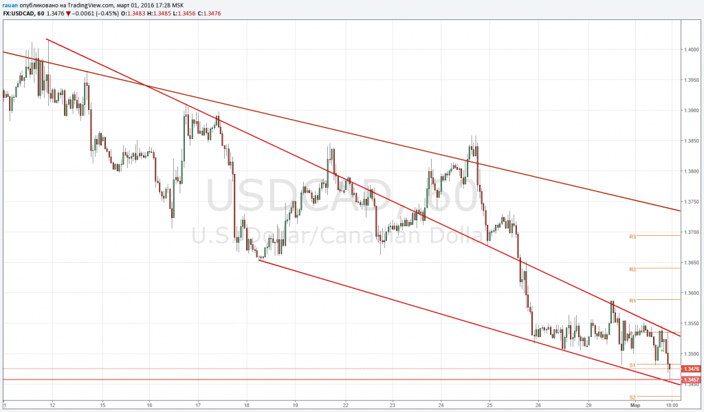 Сигнал на покупку USDCAD с целью 1.3640USDCAD на часовом таймфрейме сформировала сужающийся треугольник с границами 1.3460 — 1.3550. Нижняя совпадает с историческим уровнем поддержки (вершина 29 сен 2015), а верхняя — с дневным контрольным уровнем PP.