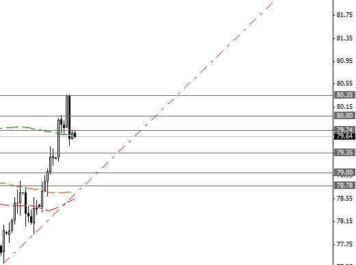 Пара USD/JPY ограничена сопротивлениями вблизи 79.74, 80.00 и 80.35, а также поддержками 79.35, 79.00 и 78.78.