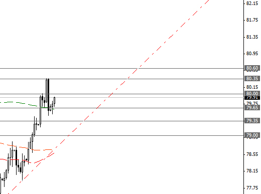 Пара USD/JPY ограничена сопротивлениями вблизи 80.00, 80.35 и 80.60, а также поддержками 79.65, 79.35 и 79.00.