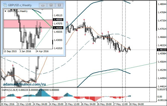 На недельном графике нисходящий тренд, так как цена находится ниже МА55. Пара вновь тестирует сопротивление на недельном графике, прохождение которого может говорить о начале перелома тенденции.