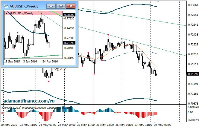 На недельном графике нисходящий тренд, так как цена находится ниже МА55. Пространство для снижения вполне достаточно до первой значимой поддержки в районе 0,69000.