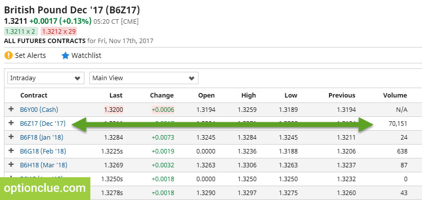 - На открывшейся страничке выбрать фьючерсный контракт, который торгуется активнее всего (самый большой Volume), например B6Z16 (это код британской валюты, декабрьский контракт 2017 года):