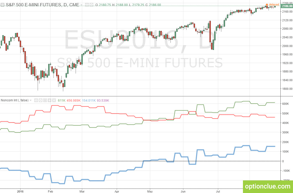 Для примера ниже представлен график фьючерса E-mini S&P500. Рассмотрим правую часть иллюстрации: индикатор нетто-позиции крупных спекулянтов растет (синяя линия) за счет увеличения числа бычьих позиций (зеленая линия) и сокращения медвежьих (красная линия).