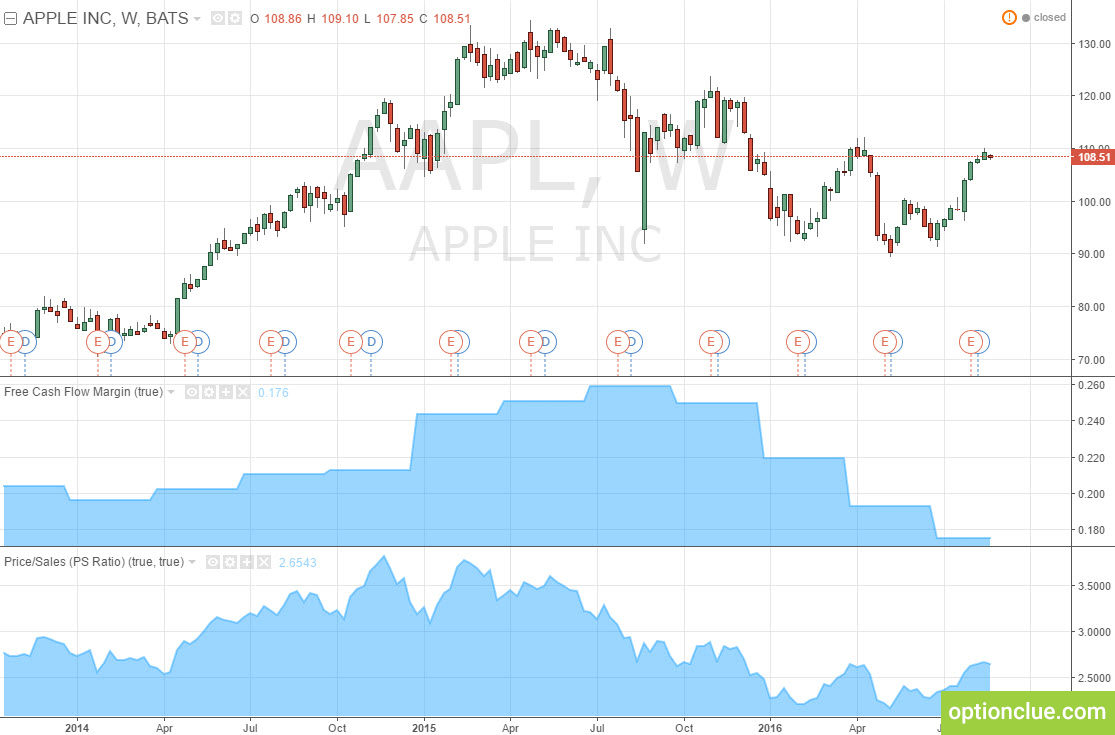 Возможности tradingview. Apple Inc. Цена (Weekly) и фундаментальные индикаторы: FCF Margin, P/S