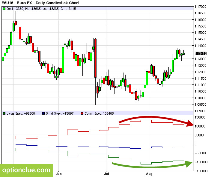 Индикатор COT на barchart. Крупные спекулянты покупают евро (выделено зеленой стрелочкой), хеджеры — продают (красная стрелочка).