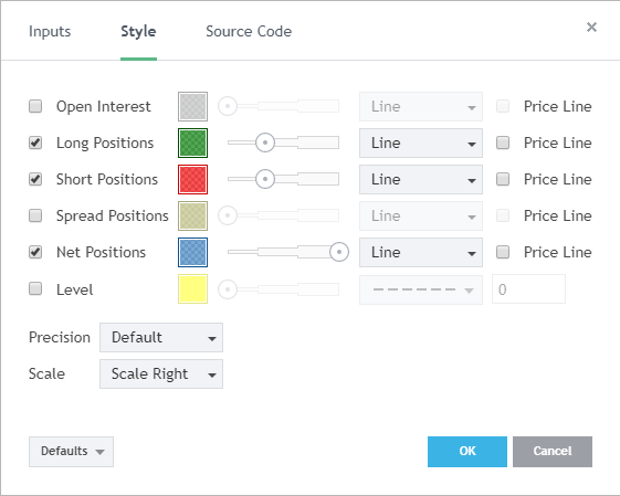 По умолчанию индикатор отображается в крайне сложном для восприятия виде, ниже представлены настройки, которые использую я: нетто-позиция крупных спекулянтов выделена голубым, длинная позиция (сделки, открытые на повышение) — зеленым, короткая позиция (сделки на понижение) — красным.