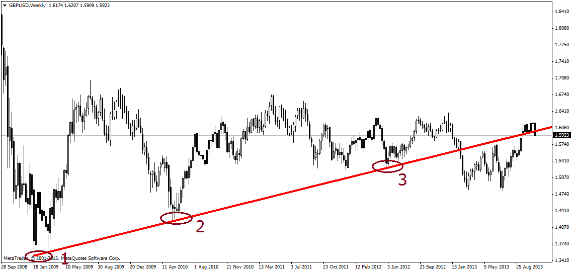 На недельном графике фунта у нас имеется вот такой пробитый аптренд, который в данном случае будет для нас служить медианой: